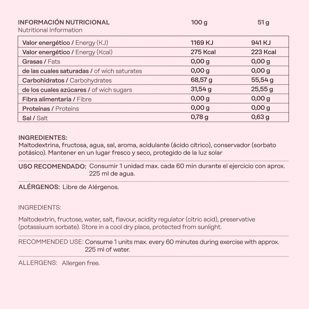 Además de proporcionar energía, nuestros geles están enriquecidos con sales minerales que reponen los electrolitos perdidos durante el ejercicio, ayudando a mantener una hidratación óptima y la funcionalidad muscular.